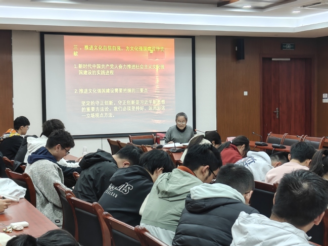 講座伊始,莊民生教授結合自身多年思政教育工作經歷,以“五老”視角解讀黨的二十大關于文化強國的戰略部署。他指出,“文化是民族的血脈,精神獨立需以文化自信為基石”,并從中華優秀傳統文化、革命文化、社會主義先進文化出發,以史為據,層層剖析文化自信的歷史邏輯,生動闡釋堅定文化自信的精神內核和對青年成長的深遠意義。莊老師鼓勵學生骨干從紅色基因中汲取力量,將“小我”融入國家發展、民族復興的“大我”,在服務同學中錘煉本領,在社會實踐中厚植情懷。