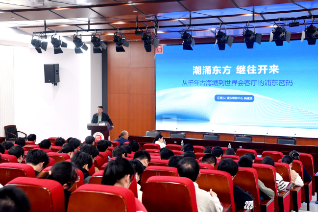 主題講座環節,吳建斌通過珍貴影像與口述史料,生動講述了浦東新區從千年古海塘的壯闊景象逐步發展成為世界會客廳的現代風貌的歷程。吳建斌帶領聽眾穿越時空,回顧了對浦東發展有重要貢獻的歷史人物和英雄事跡,讓大家深刻感受到這片熱土如何以深厚的歷史底蘊為墨、以與時俱進的時代智慧為鋒,書寫屬于中國的現代化傳奇。