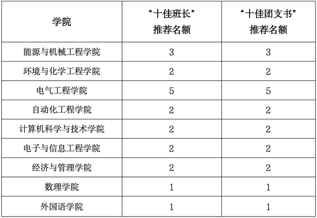 各學(xué)院可結(jié)合實(shí)際情況,推薦符合要求的“十佳班長(zhǎng)”“十佳團(tuán)支書”候選人。填寫《上海電力大學(xué)“十佳班長(zhǎng)”“十佳團(tuán)支書”申報(bào)表》(附件1)和《上海電力大學(xué)“十佳班長(zhǎng)”“十佳團(tuán)支書”信息匯總表》(附件3),推薦至校團(tuán)委。各學(xué)院名額分配如下: