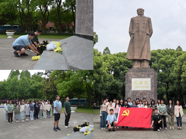 活動的最后一站是復旦大學的毛澤東雕像廣場。青銅雕像巍然矗立,偉人身著中山裝,手持書卷,目光深邃地凝望遠方,仿佛仍在關注著中國青年的成長與國家的未來。黨支部書記與黨員代表緩步走向雕像基座,獻上以白菊與黃菊為主體的花束。施文溢同志講述偉人與復旦的故事。全體同志莊重肅立,表達對先輩的深切緬懷與崇高敬意。隨后,支部成員在雕像前合影留念,定格這一莊嚴時刻。