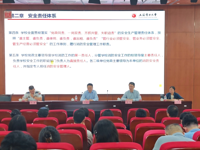 金煒宣讀學校關于聘任二級單位消防安全管理員的決定并向消防安全管理員代表頒發工作聘書,同時向學校消防安全管理員們詳細解讀《上海電力大學消防安全管理辦法》。