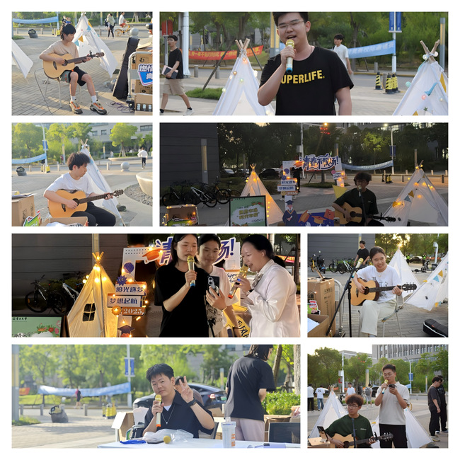 活動(dòng)現(xiàn)場(chǎng)特別設(shè)置露天駐唱舞臺(tái),邀請(qǐng)畢業(yè)班學(xué)生張茂、張礎(chǔ)巖、張亮及院十佳歌手張祉言傾情獻(xiàn)唱。《一路向北》《鳳凰花開的路口》《同桌的你》《那些年》《入海》等經(jīng)典校園歌曲引發(fā)全場(chǎng)共鳴,攤位暖黃的串燈與往來人影交織成畫,婉轉(zhuǎn)歌聲中,有人低聲跟唱,有人舉燈輕晃,點(diǎn)點(diǎn)光影搖曳如星河傾瀉。更有即興加入的“觀眾點(diǎn)歌”環(huán)節(jié),泰國(guó)留學(xué)四姐妹以一首《Body Shaming》唱出“打破偏見,擁抱自我”的宣言,掀起一場(chǎng)關(guān)于自信與勇氣的聲浪,將夏夜的熱烈氛圍推向高潮。