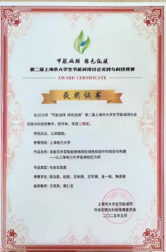 本屆大賽由上海市教育委員會、上海市大學生節能減排社會實踐與科技競賽委員會主辦,上海第二工業大學和上海市工程熱物理學會承辦,旨在推動大學生積極參與節能減排社會實踐與科技創新,助力綠色低碳發展,吸引了全市多所高校的眾多團隊踴躍參賽。在計算機學院王亮亮、蔣仁志兩位教師的悉心指導下,“多能互補型智能微電網在綠色校園中的規劃與構建——以上海電力大學臨港校區為例”團隊成員陸泓辰、趙巖、王秋雨、王宇騏、金一帆、陶彥宸歷經激烈競爭,在社會實踐調研報告賽道中,憑借扎實的專業知識、創新的設計理念以及緊密的團隊協作,成功晉級決賽。在決賽中,團隊沉著應對,深入剖析了多能互補型智能微電網在綠色校園中的規劃與構建方案,從項目目的、調研方法、痛點分析到解決方案等方面全面展示項目成果,得到了評委們的高度認可,最終榮獲大賽二等獎。