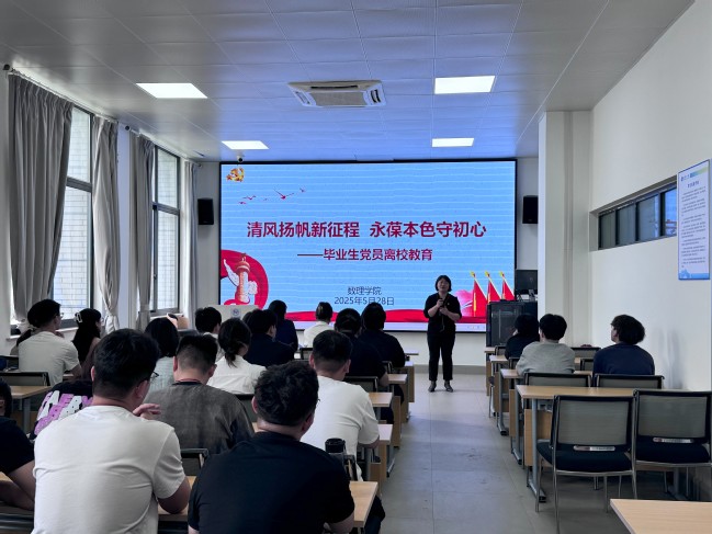 為進一步堅定畢業生黨員理想信念、強化畢業生黨員身份意識,以更加飽滿的熱情投身到未來的工作和社會生活中,5月28日,數理學院在數理樓A110會議室開展以“不忘初心 廉潔遠行”為主題的2025屆畢業生黨員離校教育大會。會議由學院兼職組織員楊雪藝主持,學院黨委副書記趙月琴、學生黨支部書記和全體畢業生黨員參加。