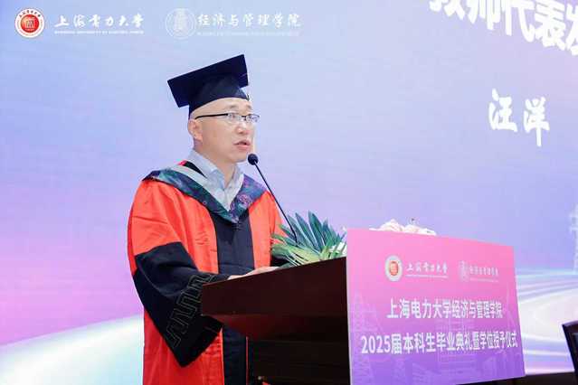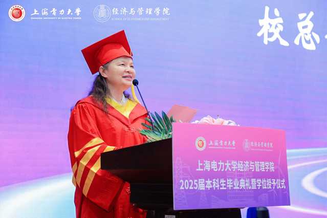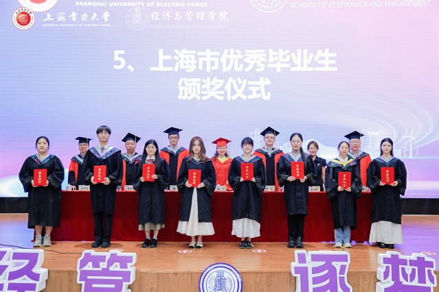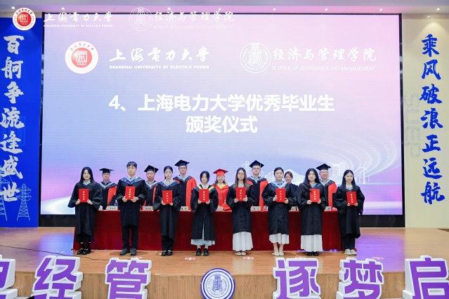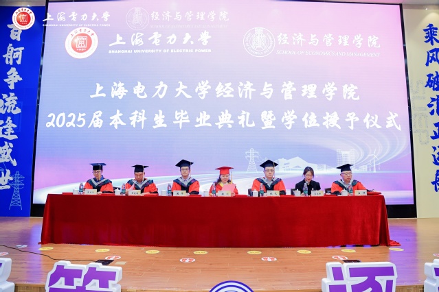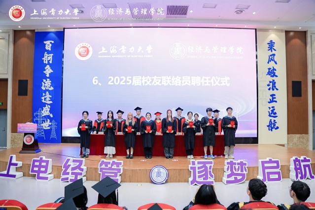 畢業典禮上,張藝宣讀經濟與管理學院2025屆上海電力大學優秀畢業生的表彰決定。潘華宣讀經濟與管理學院2025屆上海市普通高等學校優秀畢業生的表彰決定。侯建朝宣讀經濟與管理學院2025屆校友聯絡員聘任的決定。學院領導及教授代表分別為受表彰代表頒獎,為校友聯絡員代表頒發聘書。