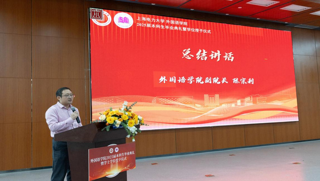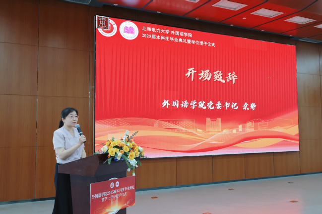 在莊嚴的國歌聲中,典禮正式拉開帷幕。余靜在致辭中代表學院向圓滿完成學業的2025屆畢業生致以熱烈祝賀和美好祝福,并提出三點期許:一是以包容之態去擁抱未來人生,用廣博胸襟容納多元世界,肩負外語人使命,傳播中華文化、講好中國故事,做文明交流的使者;二是用克難之勇去翻越每座高山,永葆樂觀心態,在挑戰中自我成長;三是用友愛之心去傳遞每份溫暖,誠實守信,以誠待人,“讓世界因你們更美好”。她勉勵畢業生們“做一個高尚、純粹、有道德、有益于人民的人!”