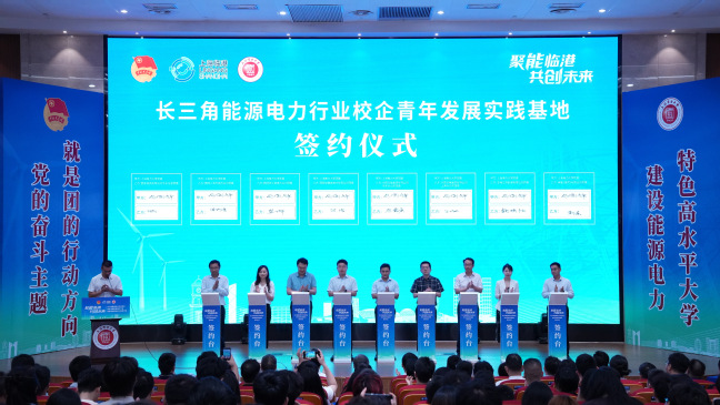 在簽約儀式環節,我校團委與國家電網有限公司華東分部團委、國網上海市電力公司團委、國網浙江省電力公司團委、國網安徽省電力有限公司團委、中國華能集團有限公司華東分公司團委、中國華電集團有限公司上海分公司團委、華電江蘇能源有限公司團委、申能(集團)有限公司團委、安徽省能源集團有限公司團委、中國電力工程顧問集團華東電力設計院有限公司團委、上海電力股份有限公司團委、上海電力設計院有限公司團委、中國能源建設集團江蘇省電力設計院有限公司團委、上海電力建設有限責任公司團委、上海治臻新能源股份有限公司等15家長三角能源電力行業企業團組織和企業簽署青年發展實踐基地。