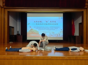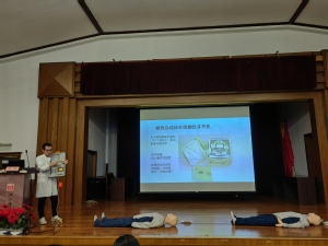 吳坤為在場師生系統講解了心肺復蘇(CPR)和自動體外除顫儀(AED)在突發事件中的重要意義,詳細介紹了CPR的判斷步驟、按壓手法與節奏控制要點,以及AED的結構原理、使用流程與常見誤區,并通過圖文資料、案例分析和科普視頻相結合的方式,讓大家對CPR與AED的規范操作有了更為直觀且清晰的認識。在掌握基本理論之后,同學們分組進行實操練習,依次在人體模型上完成CPR、AED貼片定位等急救操作,兩位主講醫師耐心指導,逐一糾正操作細節,確保每位參與者都能掌握要領、規范施救。