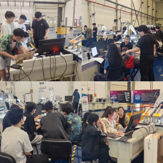 在隨后的實訓課程中,同學們分組深入學習并實踐了三大前沿技術模塊。在ABB機器人數據采集環節,各小組通過實操掌握了工業機器人數據接口配置與實時數據獲取技術;在數字孿生建模技術實踐中,同學們完成了ABB機器人工作站數字孿生模型搭建與運動學仿真,利用虛擬同步技術,實現物理機器人工作站與虛擬模型的實時數據映射;而在視覺+機器人工作站集成與數據映射項目中,大家成功實現了動態環境下的實時目標識別與抓取,構建了數字孿生映射系統,同步物理系統與虛擬模型的運行狀態。實訓過程中,各小組同學熱情高漲,他們有的負責程序編寫,有的專注設備調試,有的進行數據驗證,通過團隊協作攻克一個又一個的技術難題。授課老師全程指導,及時解答同學們在集成測試中遇到的實際問題,現場學習氛圍濃厚而有序。