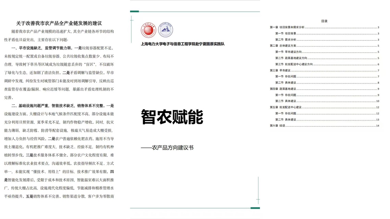 調研期間,隊員們不僅學習了豐富的農業知識,還積極參與助農實踐,將調研結果進行詳細記錄整理,并結合專業知識,撰寫了《上海電力大學赴寧夏固原實踐隊“智農賦能”農產品建議書》《關于改善我市農產品全產業鏈發展的建議》,為當地農業產業發展升級提供專業建議,并制作宣傳頁分發給當地農戶,提升當地農業種植管理水平,以實際行動助力鄉村振興戰略落地,促進當地農業產業升級以及經濟高質量發展。
