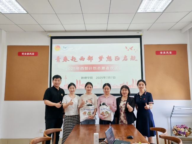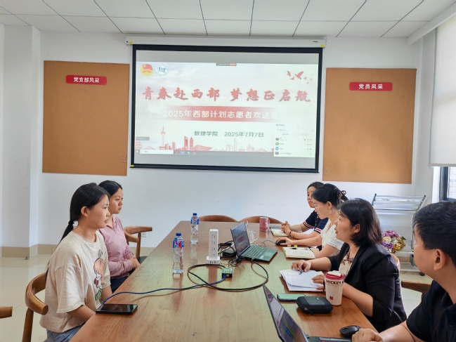 7月7日,數理學院以“線上+線下”相結合的形式舉辦2025年西部計劃志愿者歡送會。會議由學院黨委副書記趙月琴主持,志愿者代表、院團委書記康鴻軒、志愿者導師及輔導員出席。