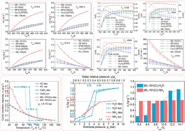 通過穩定性和吸附性能的實驗和計算結果,綜合優選五種MOFs-氨工質對并結合吸附循環分別評價了熱泵、制冷、制冰、長/短周期儲熱等場景下的性能,揭示了熱能轉換與儲存性能與解吸溫度、蒸發溫度和吸附溫度的內在關系。最終對比了MOF-氨工質對與傳統吸附劑-氨工質對以及MOF-水工質對的供儲熱性能,發現MOF-氨工質對在低溫環境的供熱場景下具有顯著性能優勢,為極端氣候下的實際應用提供了新思路。