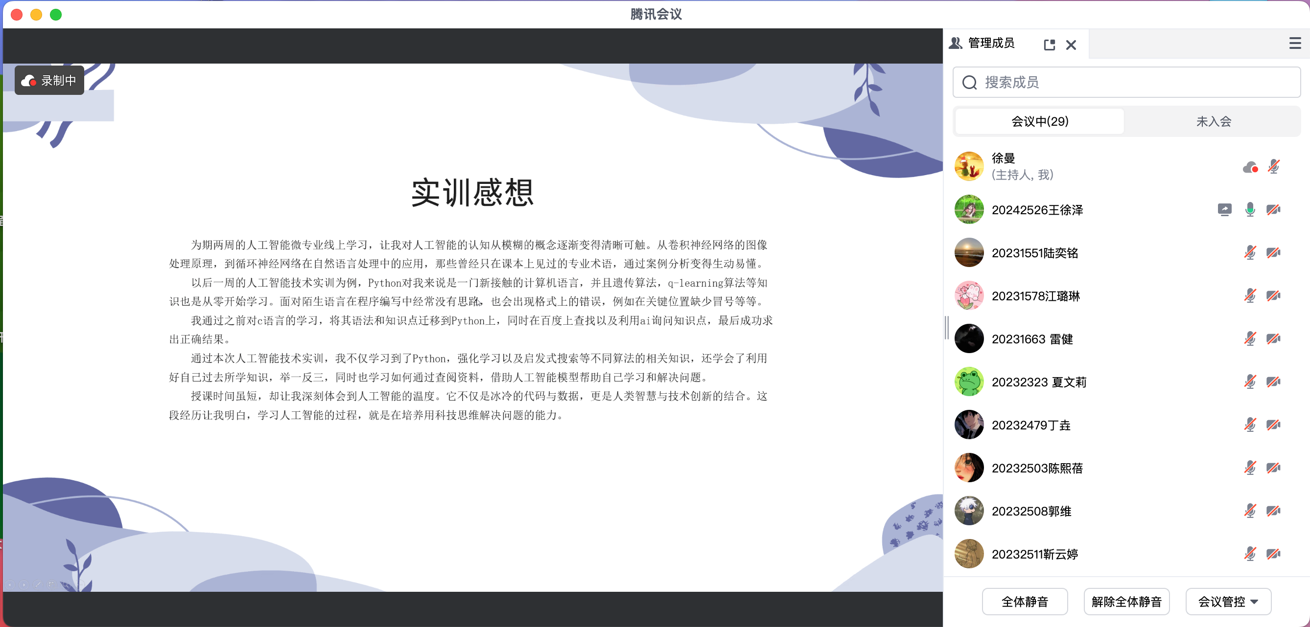 在課程答辯中,學生們既展示了實驗相關的原理、步驟、結果及分析,也深入研究了相關AI前沿技術,并基于廣泛調研提出個人見解,體現了我校學生較扎實的理論基礎、研究能力和較強的AI工具使用能力,以及人工智能技術快速發展背景下批判思維和創新意識與能力。學生在課程答辯中表示,“為期兩周的人工智能微專業線上學習,讓我對人工智能的認知從模糊的概念逐漸變得清晰可觸,從卷積神經網絡的處理原則,到循環神經網絡在自然語言處理重點應用,那些曾經只在課本上見過的專業術語,通過案例分析變得生動易懂”。