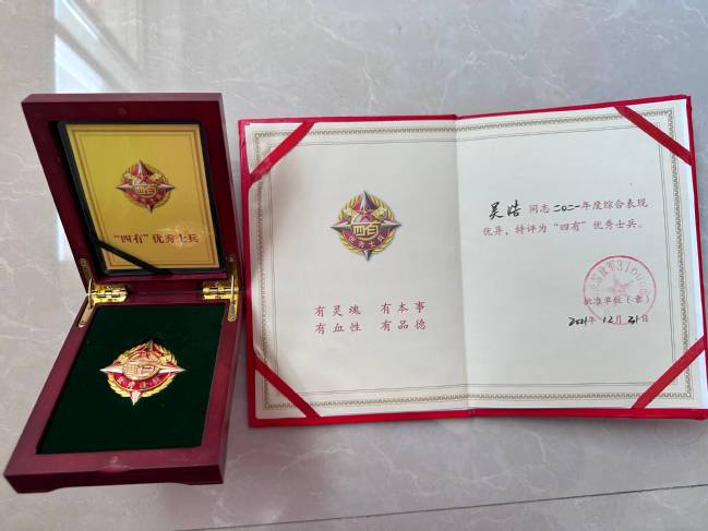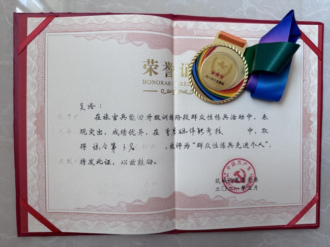 秉持著“逢敵敢亮劍”的精神,我刻苦訓練,沖鋒在前,不斷鞭策自己,努力提高軍事技能。體能考核常年全連第一,并在2021年3月的全營群眾性練兵比武中取得了“全營體能第三”的佳績。在2021年底被評選為義務兵骨干,2022年通過了集團軍“預提指揮士官”考核,被評為“區隊先進個人”。這些成績的背后,無不體現著我對軍營的無限熱愛和對軍人身份的無比自豪。