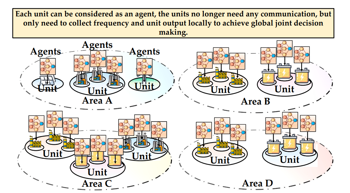 針對(duì)在基于性能的頻率調(diào)節(jié)市場(chǎng)運(yùn)行的互聯(lián)電網(wǎng)中,因策略不協(xié)調(diào)和聯(lián)絡(luò)線功率波動(dòng)導(dǎo)致運(yùn)營(yíng)商利益沖突加劇、頻率波動(dòng)頻繁的問(wèn)題,為提升電網(wǎng)穩(wěn)定性,李嘉文副教授和崔昊楊教授及其團(tuán)隊(duì)創(chuàng)新性提出模仿魷魚分布式神經(jīng)決策機(jī)制的魷魚啟發(fā)協(xié)同負(fù)荷頻率控制方法,將區(qū)域單元視為獨(dú)立智能體,僅依賴本地信息實(shí)時(shí)決策以避免跨區(qū)通信延遲或錯(cuò)誤;并引入采用混合課程學(xué)習(xí)策略的自動(dòng)課程多智能體深度元演員-評(píng)論家算法,實(shí)現(xiàn)復(fù)雜隨機(jī)電網(wǎng)中多目標(biāo)多區(qū)域的高效協(xié)同學(xué)習(xí)與魯棒控制;基于中國(guó)南方電網(wǎng)四區(qū)模型的仿真驗(yàn)證表明該方法能有效減少功率波動(dòng)。其工程價(jià)值在于為多運(yùn)營(yíng)商互聯(lián)電網(wǎng)提供了可規(guī)避通信瓶頸、有效協(xié)調(diào)利益沖突并顯著抑制頻率及聯(lián)絡(luò)線功率波動(dòng)的實(shí)用化頻率控制新方案,推進(jìn)了智能電網(wǎng)穩(wěn)定運(yùn)行技術(shù)的發(fā)展。該成果以《Bionic cooperative load frequency control in interconnected grids: A multi-agent deep Meta reinforcement learning approach》為題發(fā)表于《Applied Energy》(中科院一區(qū),IF=10.1)。