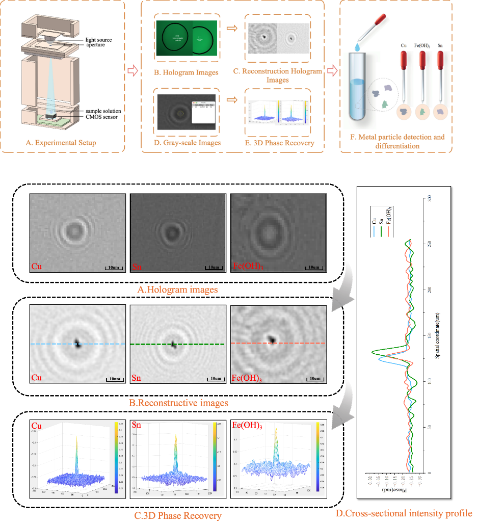 針對(duì)鉛酸電池電解液中金屬雜質(zhì)檢測(cè)傳統(tǒng)方法成本高、操作復(fù)雜等瓶頸問(wèn)題,2023級(jí)研究生周昊、薛亮教授和崔昊楊教授及其團(tuán)隊(duì)創(chuàng)新性提出“基于無(wú)透鏡數(shù)字全息技術(shù)的金屬雜質(zhì)顆粒檢測(cè)方法”,利用緊湊的設(shè)備配置,采用綠色 LED 光源和 CMOS 相機(jī)捕獲雜質(zhì)的全息圖像,并通過(guò)角譜算法重建清晰的粒子圖像,進(jìn)而依據(jù)重建距離和平均灰度差分析實(shí)現(xiàn)對(duì)銅、錫和鐵等金屬雜質(zhì)的快速精準(zhǔn)識(shí)別與區(qū)分,為電池維護(hù)與質(zhì)量控制提供了低成本、高效率的解決方案,對(duì)提升儲(chǔ)能系統(tǒng)可靠性具有重要工程價(jià)值。該成果以《Detection of Metal Impurity Particles in Lead-Acid Battery Electrolyte Based on Lens-Free Digital Holography Technology》為題發(fā)表于《Advanced Science》(中科院一區(qū),IF=14.1)。