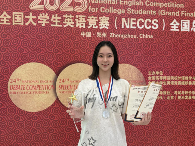 在2025年8月鄭州舉行的全國大學生英語競賽總決賽中,面對來自浙江大學、上海交通大學、北京外國語大學等高校的一眾競爭者,周佳凝同學在演講決賽環節穩定發揮,從抽題到登臺,僅用300秒便完成演講的即興架構,以較大優勢奪得全國一等獎。辯論賽場上,周佳凝更展現過硬的專業素養,贏得了評委和觀眾的好評,與團隊隊友合作斬獲全國二等獎。?