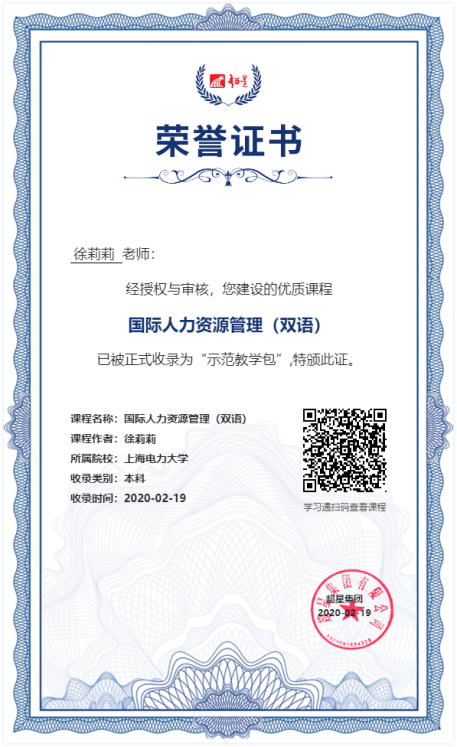 徐莉莉老師任教以來長期承擔(dān)《管理學(xué)原理》《國際人力資源管理》等雙語課程的教學(xué)工作,年授課時(shí)數(shù)均超500學(xué)時(shí),授課對(duì)象包含中外不同語種的學(xué)生。其中《國際人力資源管理(英)》是學(xué)校第一批慕課課程建設(shè)項(xiàng)目,于2019年簽約超星學(xué)銀在線教學(xué)示范包(公益),入選2022年度上海高校來華留學(xué)英語授課示范性課程。