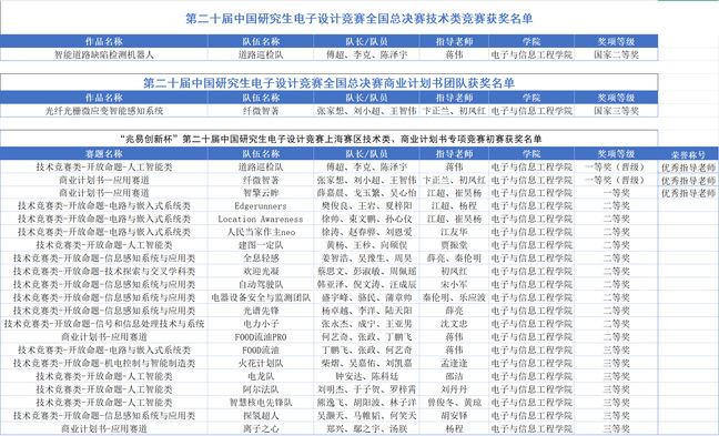 近日,第二十屆中國研究生電子設計競賽(研電賽)全國總決賽在深圳落幕。在全國總決賽中,由蔣偉老師指導的“道路巡檢隊”團隊(隊長傅超,隊員李克、陳澤宇)榮獲技術類競賽上海賽區(qū)一等獎并成功晉級全國總決賽,最終獲得全國二等獎;由卞正蘭、初鳳紅老師指導的“纖微智著”團隊(隊長張家想,隊員劉小超、王智偉)獲得商業(yè)計劃書專項賽上海賽區(qū)一等獎并晉級全國總決賽,最終奪得商業(yè)計劃書團隊全國三等獎;由江超、崔昊楊老師指導的“智擎云眸”團隊(隊長薛嘉晨,隊員戈玉繁、吳心怡)同樣表現(xiàn)優(yōu)異,榮獲商業(yè)計劃書專項賽上海賽區(qū)一等獎。學校被授予“上海賽區(qū)優(yōu)秀組織獎”,蔣偉、卞正蘭、江超三位指導老師被評為“上海賽區(qū)優(yōu)秀指導老師”。