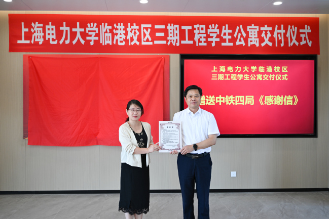 在校黨委副書記仰頤和原副校長(zhǎng)封金章的見證下,康志田與項(xiàng)目代建單位上海教育建設(shè)管理咨詢有限公司總經(jīng)理朱欽思向我校基建處處長(zhǎng)韋應(yīng)祺交付象征竣工完成的“金鑰匙”。仰頤代表學(xué)校臨港校區(qū)三期工程項(xiàng)目管理指揮部向中鐵四局集團(tuán)有限公司代表康志田贈(zèng)送《感謝信》。