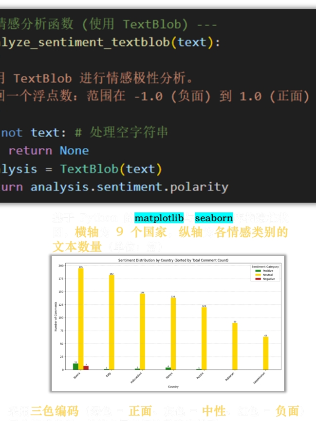 項目直面部分西方媒體對中國能源政策的曲解,構建“自塑與他塑”解決方案:在數據采集端,團隊運用Python爬蟲技術抓取肯尼亞《標準報》等9國主流媒體數據,結合TextBlob情感分析模型,繪制出直觀的“國家-情感極性”可視化圖譜;在傳播策略端,團隊采用半結構化提問框架,從認知、媒介、情感三維度,深度調研了187份覆蓋13國留學生的訪談數據,量化分析國際視角下中國能源政策認知差異因素。