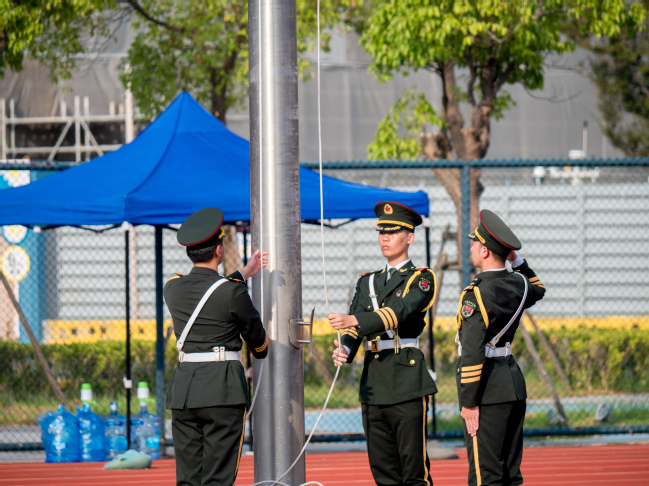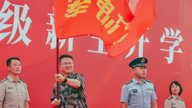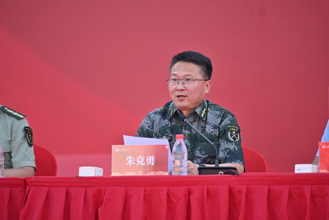 朱克勇向軍訓(xùn)師授旗,并對(duì)全體學(xué)員提出三點(diǎn)希望:一要心懷家國(guó),志存高遠(yuǎn),在銘記歷史中汲取奮進(jìn)力量。二要迎難而上,百煉成鋼,在艱苦訓(xùn)練中錘煉意志品質(zhì)。三要令行禁止,團(tuán)結(jié)協(xié)作,在嚴(yán)明紀(jì)律中凝聚集體力量。他明確要求全體組訓(xùn)人員要堅(jiān)持“以人為本”,做到科學(xué)組訓(xùn)、文明施訓(xùn),同時(shí)叮囑同學(xué)們?cè)鰪?qiáng)安全意識(shí),做好自我防護(hù),合理調(diào)整狀態(tài)、注意勞逸結(jié)合。最后,他強(qiáng)調(diào)各相關(guān)部門要加強(qiáng)協(xié)調(diào)、密切配合,全力做好后勤保障、醫(yī)療服務(wù)等各項(xiàng)工作,確保本次軍訓(xùn)工作安全、有序、順利。