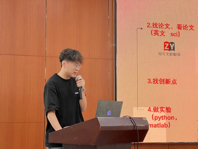 李毅凡以“科研論文全流程實(shí)戰(zhàn)指南”為核心展開講解,他將科研路徑拆解為“領(lǐng)域確定—文獻(xiàn)研讀—?jiǎng)?chuàng)新點(diǎn)挖掘—方案設(shè)計(jì)—實(shí)驗(yàn)開展—論文撰寫—投稿返修—錄用”八大關(guān)鍵步驟。針對(duì)創(chuàng)新點(diǎn)突破難題,他提出融合策略——既可深耕本領(lǐng)域進(jìn)行方法整合,也可跨學(xué)科遷移技術(shù)突破局限,特別建議結(jié)合學(xué)校電力自動(dòng)化特色尋找研究切口。另外,他還分享了實(shí)用科研工具:知云文獻(xiàn)翻譯、GPT、Origin、Visio等,并強(qiáng)調(diào)工具只是輔助,核心在于培養(yǎng)獨(dú)立思考能力,建議新生根據(jù)研究需求合理選擇,避免過度依賴技術(shù)手段。