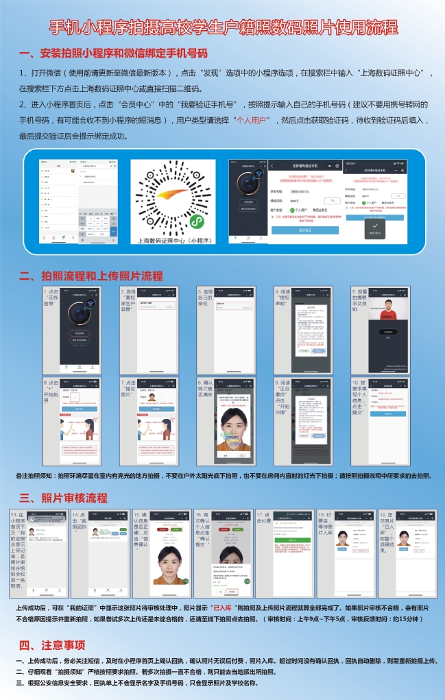 選擇:高校學生戶籍照—上海電力大學。根據提示完成拍照、上傳照片、照片審核流程。照片審核(平臺審核時間9:00-17:00),收到審核合格短信及時去確認回執,還需點擊“數碼回執”進行回執確認,時就要重新拍照上傳。“我的回執確認記錄”顯示狀態:審核合格(已入庫),才能完成本次戶籍照拍攝流程。101524點前學校統一結算拍照費用;10160點之后在該小程序上進行采集的需自費10元。