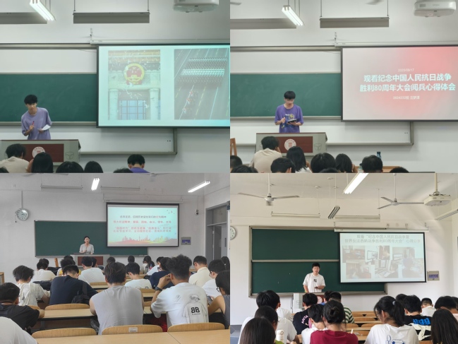 為傳承偉大抗戰精神,激發學生愛國熱情,首日教育現場組織學生分享觀看紀念中國人民抗日戰爭暨世界反法西斯戰爭勝利80周年大會直播的心得感悟。學生代表結合歷史文獻與時代背景,從“抗戰精神的時代價值”“青年一代的使命傳承”等角度展開交流,學生談到:“從無數先烈用生命守護家國,到如今我們為強國建設拼搏,‘愛國’二字始終是不變的精神內核。作為數理學子,我們更要以扎實的專業能力,為國家科技發展貢獻力量?!闭鎿吹姆窒碜屚瑢W們進一步強化了銘記歷史、珍愛和平、奮勇前行的思想自覺。