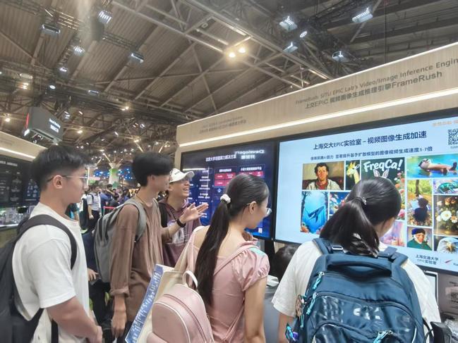最后,師生們來到世博展覽館的互動體驗區,近距離接觸前沿技術產品。現場,上海交大EPIC實驗室的視頻圖像生成加速技術等成果以及電力配網光通信等相關展示,呈現出數智化在不同領域改變人們生活和工作方式的多樣場景。同學們參與各類互動項目,對科技賦能各行業有了更深入的理解,切實體驗到前沿科技的魅力。