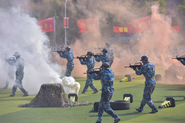 在莊嚴(yán)的國(guó)歌聲中,國(guó)旗冉冉升起,大會(huì)拉開(kāi)帷幕。三個(gè)方隊(duì)進(jìn)行了格斗、戰(zhàn)術(shù)、隊(duì)列的匯報(bào)展示。