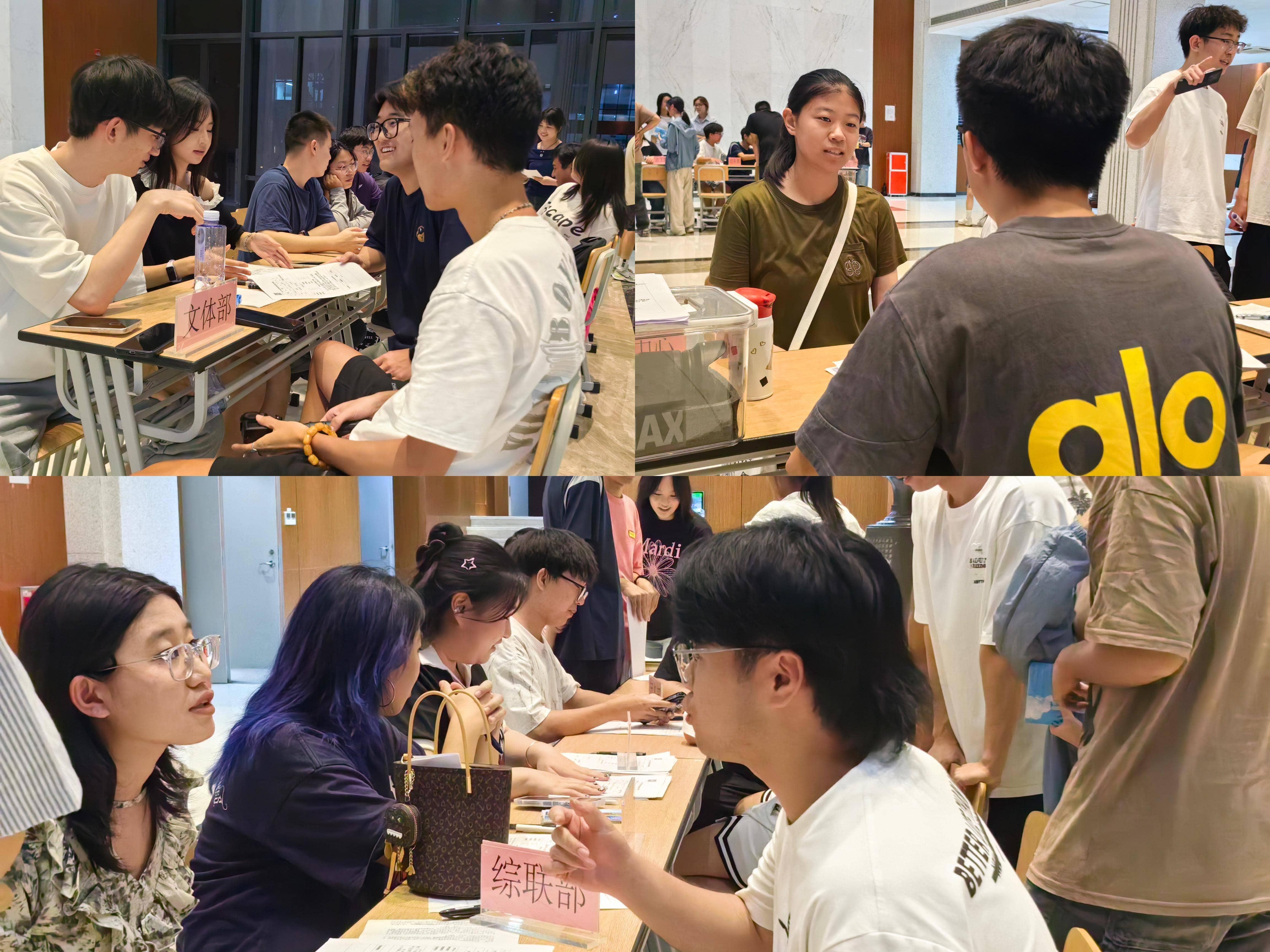 會后,團學(xué)納新活動面試環(huán)節(jié)在學(xué)術(shù)樓大廳展開。新同學(xué)們駐足心儀的部門攤位前,認(rèn)真聆聽介紹,輕聲交流,并填寫下屬于自己的納新報名表。負責(zé)納新的學(xué)長學(xué)姐耐心解答關(guān)于部門日常工作、活動形式等問題,分享自己在團學(xué)的成長故事,向?qū)W弟學(xué)妹們展現(xiàn)部門的獨特魅力。
