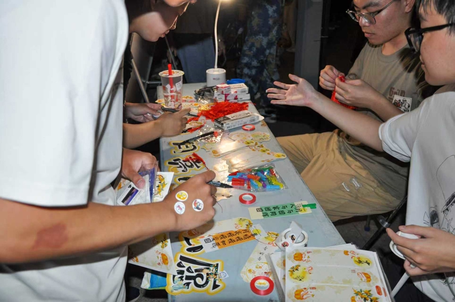由學校精心打造的 “月下非遺市集”,成為新生感受傳統文化與校園特色交融的絕佳去處。市集里,一面面精美的扇面將書畫藝術與傳統美學完美結合,新生們駐足欣賞,不時與創作者交流心得;扎染體驗區前更是人頭攢動,在非遺老師的耐心指導下,新生們親手將白布折疊、捆扎,再浸入調配好的染料中,親眼見證布料在染色過程中 “千變萬化” 的奇妙效果。不少新生將親手制作的扇面、扎染作品珍藏起來,當作融入校園文化的第一份 “專屬紀念”。