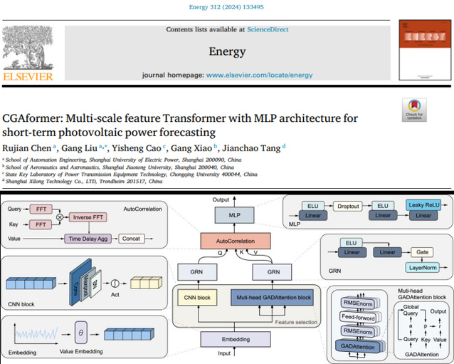 在《Energy》上發表的論文“CGAformer: Multi-scale feature Transformer with MLP architecture for short-term photovoltaic power forecasting”(DOI: 10.1016/j.energy.2024.133495),針對光伏發電的強波動性、高間歇性及明顯周期性特點,提出了基于一維卷積神經網絡、全局累加注意力和自相關的混合模型 CGAformer,用于短期光伏功率預測,實現了多尺度特征的高效捕獲。