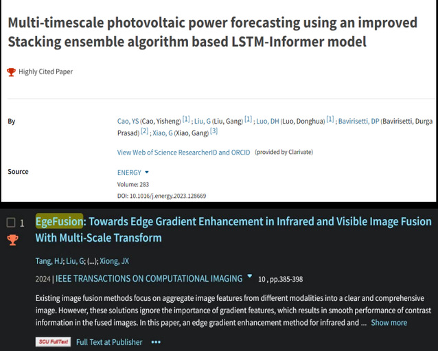 此外,在《Energy》上發表“Multi-timescale photovoltaic power forecasting using an improved Stacking ensemble algorithm based LSTM-Informer model”(DOI: 10.1016/j.energy.2023.128669)和《IEEE Transactions on Computational Imaging》上發表“EgeFusion: Towards Edge Gradient Enhancement in Infrared and Visible Image Fusion With Multi-Scale Transform”(DOI: 10.1109/TCI.2024.3369398)入選全球ESI前1%高被引論文。