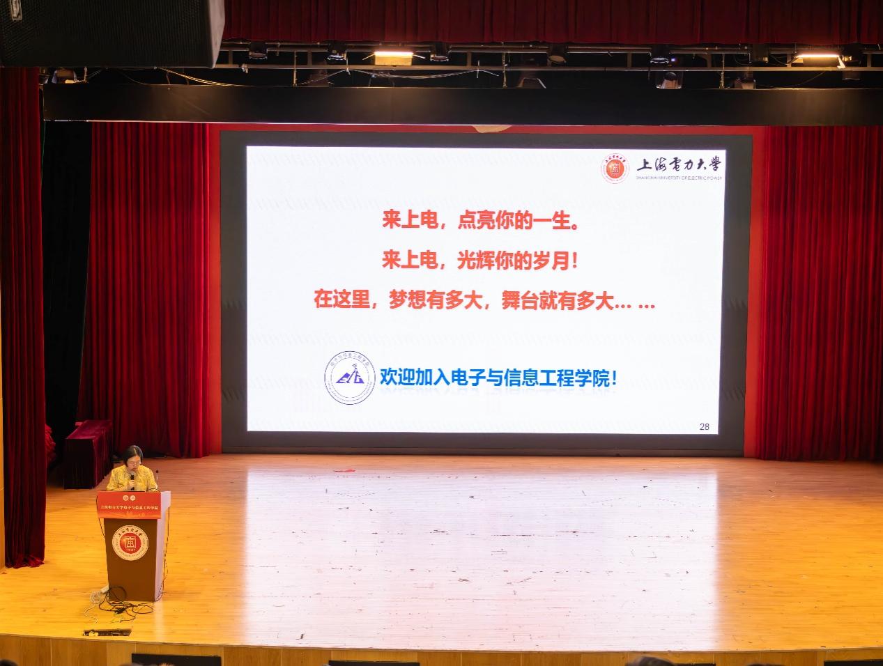 隨后,薛亮介紹了學(xué)校、學(xué)院和專業(yè)情況。她首先回顧了上海電力大學(xué)作為“電力工程師的搖籃”七十余年的輝煌辦學(xué)歷史,以及學(xué)校在學(xué)科建設(shè)與能源電力領(lǐng)域的突出優(yōu)勢。她重點(diǎn)闡述了電信學(xué)院的發(fā)展沿革、師資力量與學(xué)科布局,展示了學(xué)院在科學(xué)研究、學(xué)生科創(chuàng)競賽以及高質(zhì)量就業(yè)方面取得的豐碩成果,特別是畢業(yè)生在集成電路、信息通信、能源電力等國家重點(diǎn)行業(yè)受到廣泛歡迎,鼓勵新生們充分利用學(xué)院提供的優(yōu)質(zhì)平臺,規(guī)劃好大學(xué)生涯,學(xué)有所成。