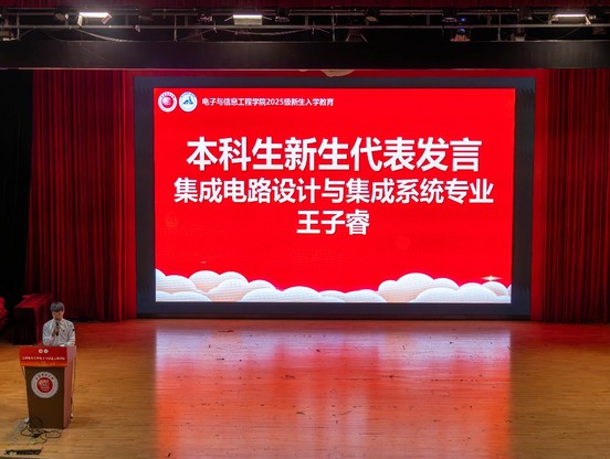 2025級集成電路設(shè)計與集成系統(tǒng)專業(yè)本科生王子睿作為本科新生代表發(fā)言。面對未來的學(xué)業(yè)挑戰(zhàn),他號召同學(xué)們保持軍訓(xùn)中錘煉的毅力與專注,深耕專業(yè)、錘煉能力,并表示將快速適應(yīng)大學(xué)生活,恪守院訓(xùn),努力成為“懂技術(shù)、能實(shí)踐”的電子信息人才,并將個人理想融入國家在電子信息領(lǐng)域的發(fā)展需要,勇?lián)鷷r代使命,貢獻(xiàn)青春力量。