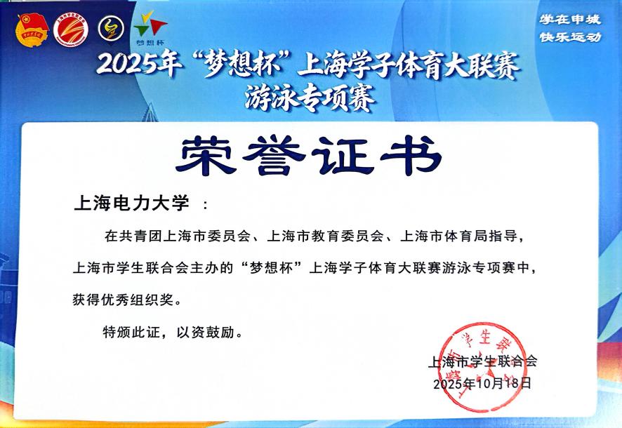 10月18日,由共青團上海市委員會、上海市教育委員會、上海市體育局指導,上海市學生聯(lián)合會主辦,上海中僑職業(yè)技術大學承辦的“夢想杯”上海學子體育大聯(lián)賽游泳專項賽在上海中僑職業(yè)技術大學游泳館落幕。本次賽事中,我校人工智能學部盧珍老師擔任領隊,陸鑫一老師擔任教練,共選派12名運動員組成代表隊參賽,因表現(xiàn)出色,我校最終榮獲“優(yōu)秀組織獎”。