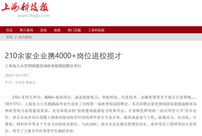 《上海科技報(bào)》210余家企業(yè)攜4000+崗位進(jìn)校攬才 上海電力大學(xué)2026屆首場(chǎng)秋季校園招聘會(huì)舉行