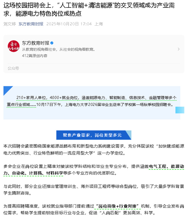 《東方教育時(shí)報(bào)》這場(chǎng)校園招聘會(huì)上,“人工智能+清潔能源”的交叉領(lǐng)域成為產(chǎn)業(yè)需求,能源電力特色崗位成熱點(diǎn)