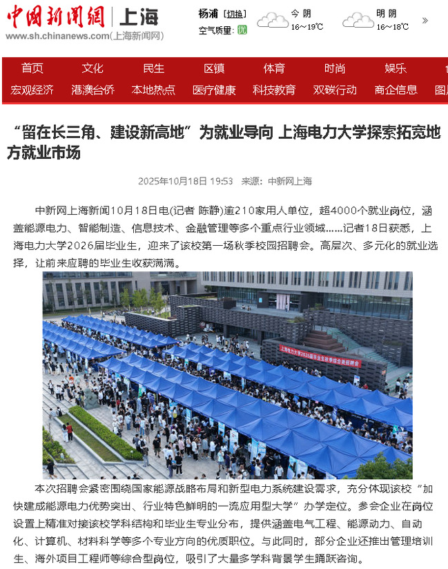《中國(guó)新聞網(wǎng)》“留在長(zhǎng)三角、建設(shè)新高地”為就業(yè)導(dǎo)向 上海電力大學(xué)探索拓寬地方就業(yè)市場(chǎng)