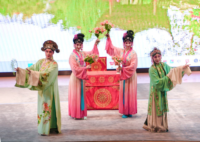 演出精選《牡丹亭》中《游園·驚夢》《尋夢》《回生》等核心選段,以細膩生動的表演,將杜麗娘與柳夢梅的愛情故事演繹得委婉動人。舞臺上,演員以水袖為筆、唱腔為弦,一顰一笑盡顯昆曲之雅,一唱一嘆皆訴人間至情。笛、簫、笙等傳統樂音與婉轉“水磨調”相映生輝,將昆曲“聲中無字,字中有聲”的韻律之美烘托得淋漓盡致,引得現場觀眾沉醉其中,掌聲不斷。