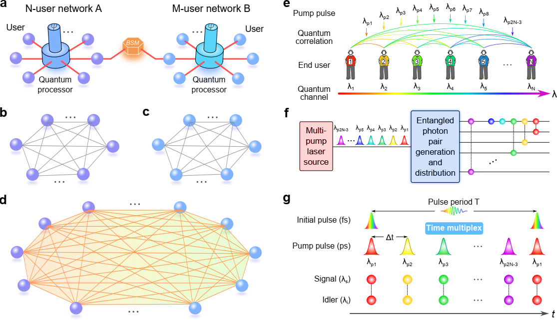 在本項(xiàng)工作中,我們針對(duì)量子融合中的關(guān)鍵科學(xué)問題,開創(chuàng)性地提出了一種全新的量子通信網(wǎng)絡(luò)構(gòu)建新方案,即主動(dòng)時(shí)間-波長復(fù)用方案(ATWM方案)(圖e,f)。該方案中,每個(gè)用戶只接收一個(gè)由分別與其他N-1個(gè)用戶糾纏的N-1個(gè)時(shí)間上獨(dú)立光子組成的波長信道。量子處理器將2N-3個(gè)在波長和時(shí)域上具有特定設(shè)計(jì)的定制泵浦脈沖通過自發(fā)參量下轉(zhuǎn)換(SPDC)過程產(chǎn)生量子糾纏光子對(duì)。隨后,糾纏光子對(duì)通過量子信道分發(fā)給最終用戶。為了有效區(qū)分不同的光子對(duì),我們使用時(shí)間復(fù)用方案來分離不同的泵浦脈沖。因此,用戶可以根據(jù)光子到達(dá)時(shí)間區(qū)分不同的糾纏態(tài)。由于自發(fā)參量下轉(zhuǎn)換過程中的能量守恒,下轉(zhuǎn)換光子對(duì)是頻率-時(shí)間糾纏的,其光譜相對(duì)于泵浦的中心波長是對(duì)稱的。所以,用戶的所有對(duì)稱波長信道可以共享不同的糾纏態(tài),從而創(chuàng)建網(wǎng)絡(luò)的全連通圖。
