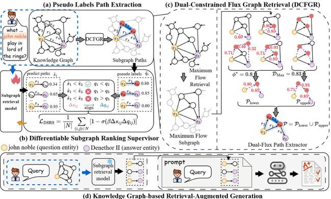 第二篇論文(DCTR)針對(duì)基于知識(shí)圖譜的檢索增強(qiáng)生成(Knowledge Graph (KG)-based Retrieval-Augmented Generation (RAG))的子圖檢索核心瓶頸展開(kāi)研究。針對(duì)傳統(tǒng)的KG-RAG方法資源消耗巨大,且產(chǎn)生的子圖不完整性和語(yǔ)義漂移的問(wèn)題。論文提出了一種針對(duì)KG-RAG的雙約束子圖優(yōu)化方法(DCTR)。該方法改進(jìn)了子圖檢索,并為L(zhǎng)LM生成具有結(jié)構(gòu)完整性和信息顯著性的高質(zhì)量子圖。具體而言,該方法將子圖生成建模為一個(gè)兩階段圖論約束優(yōu)化問(wèn)題,以生成緊湊且完整的偽標(biāo)簽。由于這些偽標(biāo)簽是離散的,因此采用平滑近似將其轉(zhuǎn)換為可微表示,從而優(yōu)化檢索器,使其在提取子圖的同時(shí)突出關(guān)鍵信息。在兩個(gè)基準(zhǔn)數(shù)據(jù)集上,DCTR顯著提升了子圖質(zhì)量,在LLM推理中取得了更好的性能。