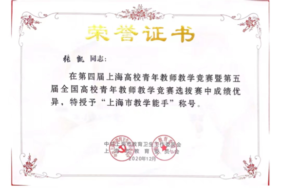 近三年他先后榮獲“上海市教學(xué)能手”、第四屆上海市高校青年教師教學(xué)競(jìng)賽一等獎(jiǎng)(自然科學(xué)應(yīng)用學(xué)科),第二屆上海市高校教師教學(xué)創(chuàng)新大賽一等獎(jiǎng)(地方高校副高組),上海電力大學(xué)第九屆青年教師教學(xué)競(jìng)賽一等獎(jiǎng)、上海電力大學(xué)第二屆教師教學(xué)創(chuàng)新大賽特等獎(jiǎng)、上海電力大學(xué)第四屆課程思政示范展示活動(dòng)特等獎(jiǎng)。