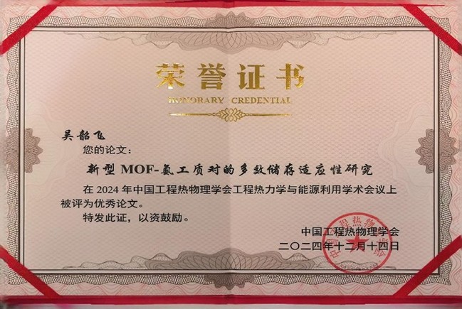 基于該論文的探索性研究成果《新型MOF-氨工質(zhì)對的多效儲存適應性研究》在2024年中國工程熱物理學會工程熱力學與能源利用學術(shù)會議上被評為大會優(yōu)秀論文獎。該工作研究了ZIF-8(Zn)復合吸附劑-氨工質(zhì)對的儲熱、制冷與儲氨性能,在高溫環(huán)境制冷和低溫環(huán)境供熱工況下展示出優(yōu)異的溫度適應性。