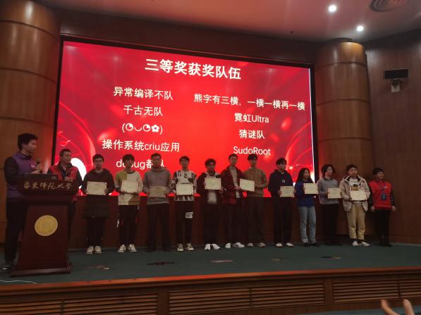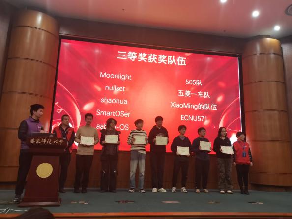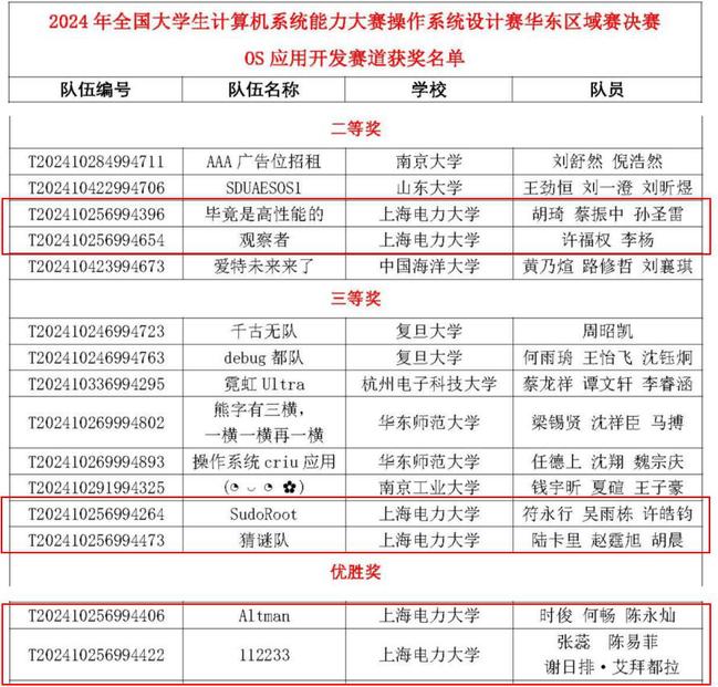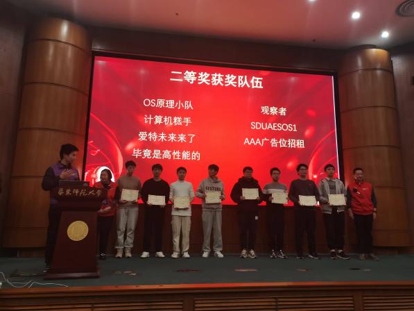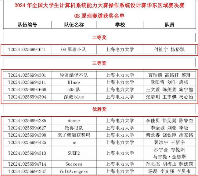2025年1月12日,2024年全國大學生計算機系統能力大賽——操作系統設計賽(華東區域賽)在華東師范大學圓滿落幕。我校計算機科學與技術學院20支隊伍進入決賽并取得優異成績,榮獲二等獎3項、三等獎6項、優勝獎10項,其中“觀察者”隊(許福權、李楊)、“畢竟是高性能的”隊(胡琦、蔡振中、孫圣雷)獲得OS應用開發賽道二等獎,“OS原理小隊”隊(付祉寧、楊裕凱)獲得OS原理賽道二等獎;“異常編譯不隊”“505隊”“blaze”“深藏blue”隊獲得OS原理賽道三等獎;“猜迷隊”“SudoRoot”隊獲得OS應用開發賽道三等獎。