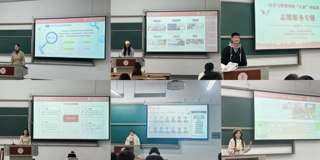 在科創實踐方面,服務站黨員徐嘉怡針對大一同學們做科創科普,介紹我校的創新創業實踐活動類型、實踐學分等;黨員陳豪、袁晴分享她們參加知行杯暑期社會實踐的經歷和備賽體驗,動員同學們將論文寫在祖國的大地上,用汗水書寫青春篇章。黨員吳繼慧、田留洋同志分享自己作為進博會志愿者的感悟和收獲,號召同學們在志愿活動中豐富自身的實踐經驗,培養社會責任感。