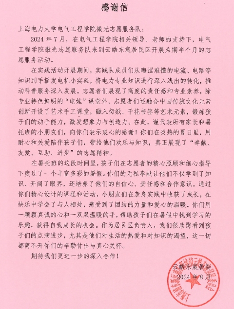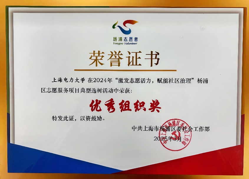 近日,在楊浦區2024年度“激發志愿活力,賦能社區治理”志愿服務項目典型選樹活動中,我校獲評“優秀組織獎”;我校電氣工程學院劉紫薇老師指導的“‘電’亮科學夢,科普進社區”志愿服務項目從83個參選項目中脫穎而出,榮獲優秀項目二等獎并入選2024年度楊浦區“激發志愿活力,賦能社區治理”志愿服務項目典型選樹案例集。