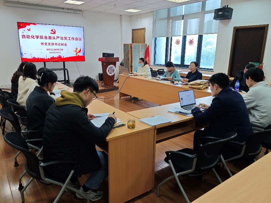 2月28日,自動化工程學院在楊浦校區致遠樓304會議室召開全面從嚴治黨工作會議暨本學期第一次黨支部書記例會,學院黨委書記劉莉、副書記王佳麗、專職組織員許曉天、兼職組織員孫懷芹及全體黨支部書記參會,會議由王佳麗主持。